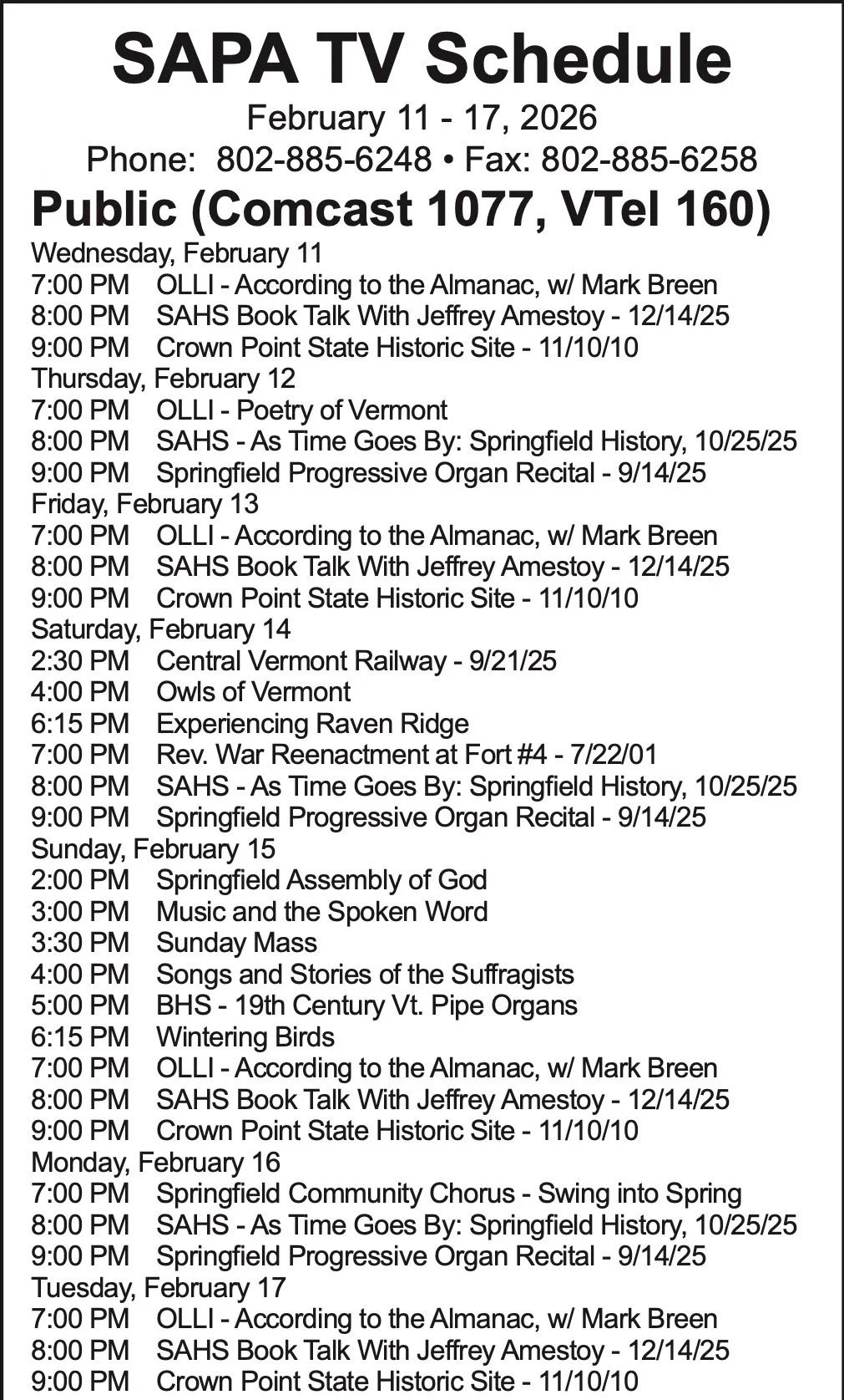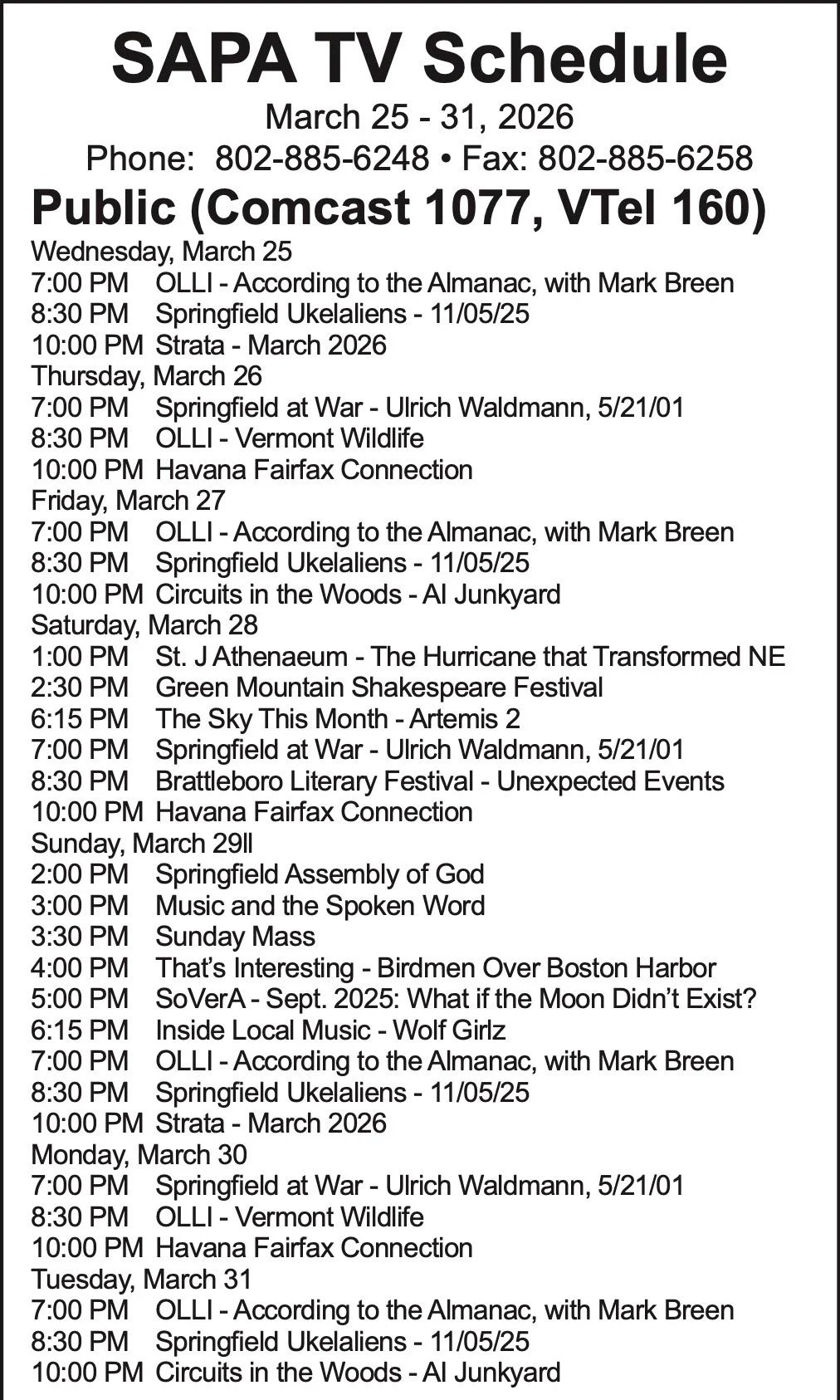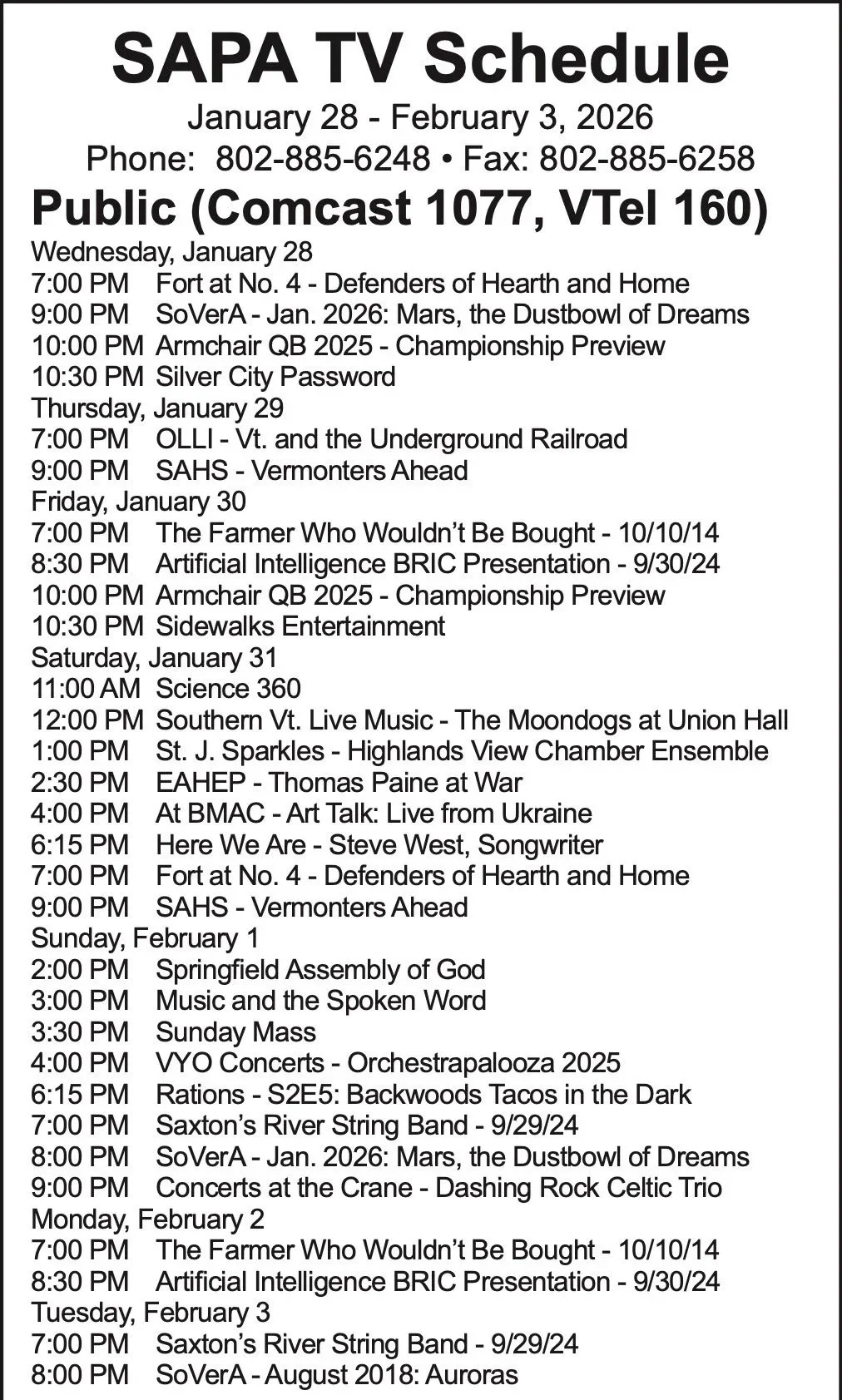 Weekly Program Schedule ~ Weekly Program Schedule ~ Weekly Program Schedule ~ Printable Schedule - Public Channel Printable Schedule - Gov/Ed Channel